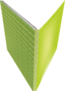 Wanneer het hoesje wordt opengeslagen, zijn de linker- en rechterzijde ook geheel full color bedrukt. De rug (links van de bevestigingstray) blijft onbedrukt. Door de kunststof bevestigingstray heen is de onderliggende bedrukking zichtbaar.